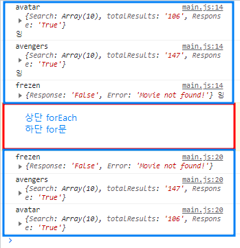// 출력은 반복을 하면서 결과값을 반환하기 때문에 배열의 순서대로 나오지 않는다.