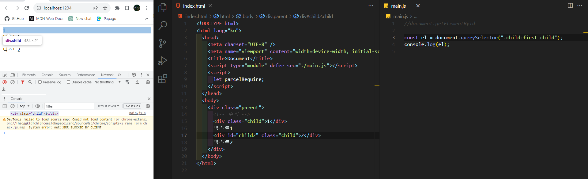 요소의 이전, 다음 형제이기 때문에 child 클래스를 가진 요소의 이전 형제는 찾을 수 없어 'null'을 반환한다.