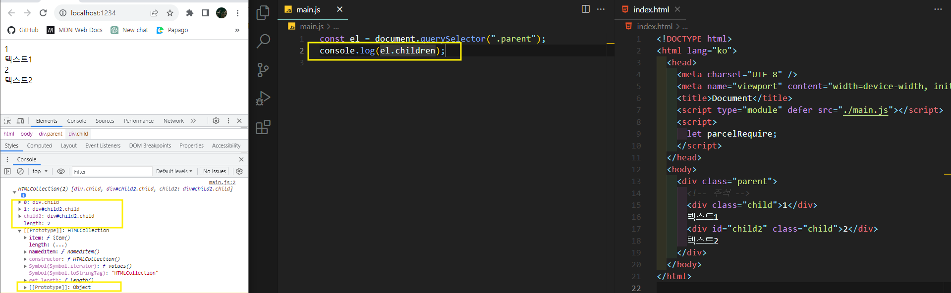 배열 같아 보이지만 하단에 HTMLCollection이라고 명시되어있으며, [[Prototype]]: Object 로 객체형태의 유사배열임을 알 수 있다.